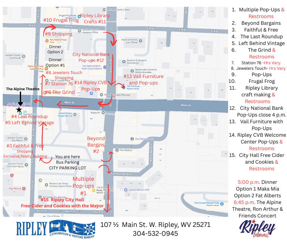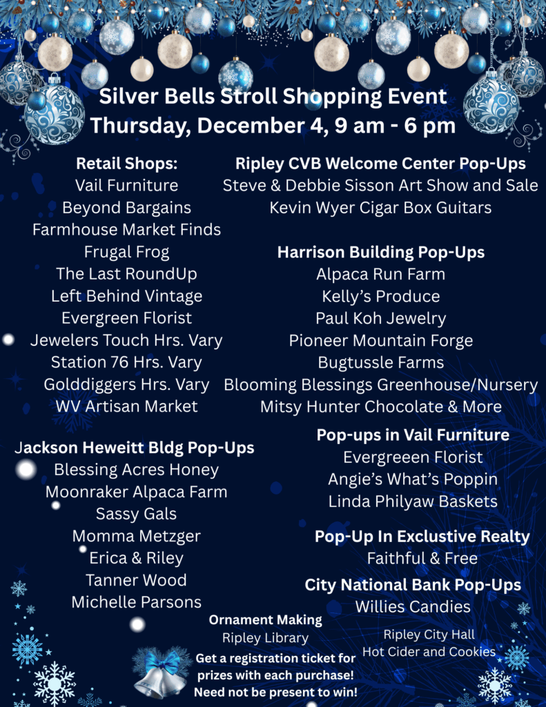 Thank you for visiting the Ripley Convention & Visitors Bureau. This site provides information on where to stay, eat, shop and visit in the community. We may be reached at 304-532-0945 should you need information.