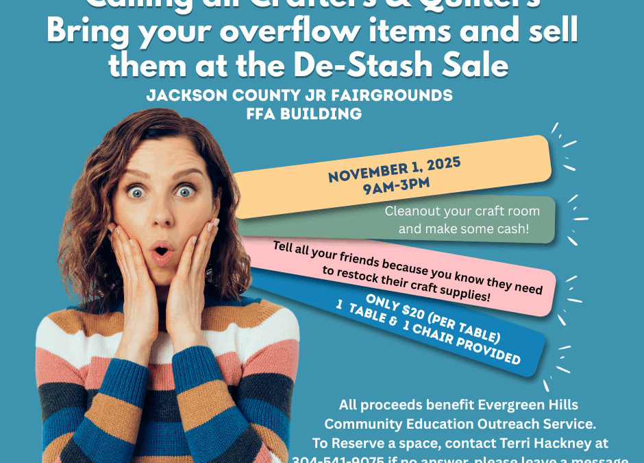 De-Stash and Craft Sale 9:00 am November 1, 2025 Jackson County Jr. Fair Grounds157 County Farm RoadCottageville, WV 25245USView LocationMap Jackson County Jr. Fair Grounds iCal Google Calendar View full calendar