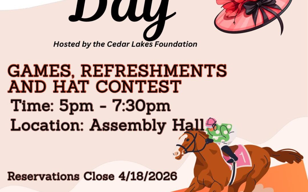 Category: General Derby Day by Brenda Mobley | Apr 3, 2026 Derby Day 5:00 pm – 7:30 pmMay 2, 2026 Cedar Lakes Conference Center82 FFA DriveRipley, WV 25271Jackson304-372-7860View LocationMap Cedar Lakes Conference Center iCal Google View full calendar