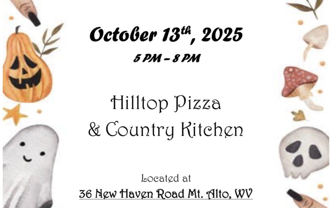 Hilltop Pizza Trunk or Treat 5:00 pm – 8:00 pmOctober 13, 2025 Hilltop Pizza & Country Kitchen36 Newhaven RoadMt. Alto, WV View LocationMap Hilltop Pizza & Country Kitchen iCal Google Calendar View full calendar
