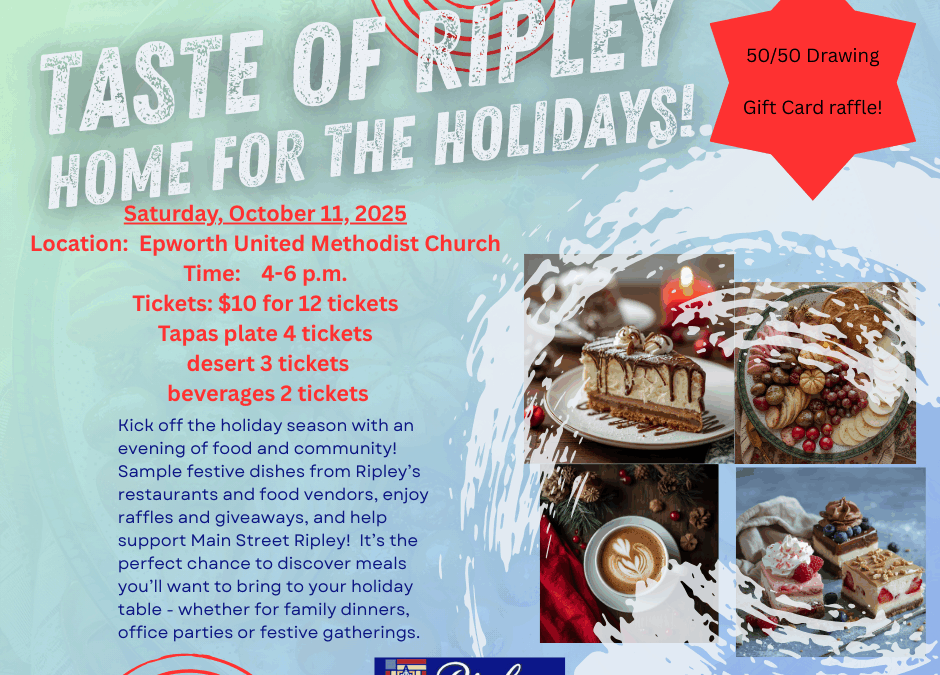 Category: General Taste of Ripley by Brenda Mobley | Sep 18, 2025 Taste of Ripley 4:00 pm – 6:00 pmOctober 11, 2025 Epworth United Methodist Church299 Church Street NRipley, WV 25271JacksonView LocationMap Epworth United Methodist Church iCal Google Calendar View full calendar